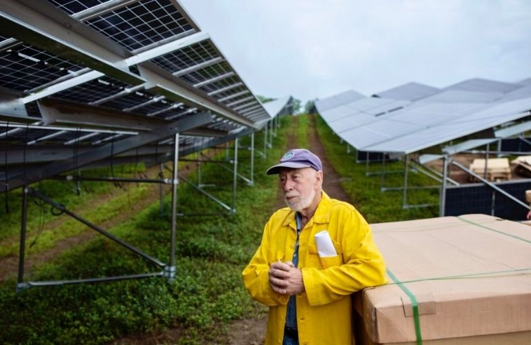 Blueberry farmer Paul Sweetland stands near a bifacial solar array that was installed on the blueberry fields he farms at the Rockport Maces Pond agrivoltaic project site. Photo credit: Brianna Soukup of Press Herald