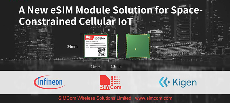 SIMCom announced that the SIMCom NB-IoT SIM7070 module measuring only 24 mm x 24 mm can now be equipped with a compact eSIM security controller from Infineon powered by GSMA-compliant remote SIM management software provided by Kigen (UK) Ltd.