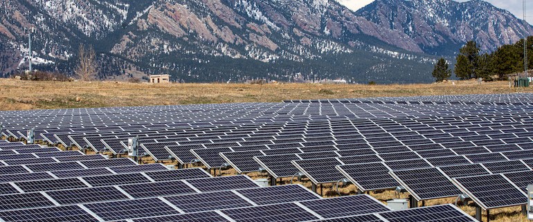 The 1-MW photovoltaic array at the Flatirons Campus (FC) of the National Renewable Energy Laboratory (NREL) has a backdrop of the foothills of the Rocky Mountains. (Photo by Werner Slocum / NREL)